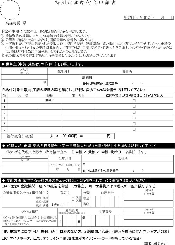 第5条 町は、第2条で定めた申請・受給権者に対し、あらかじめ給付対象者を記載した特別定額給付金申請書((