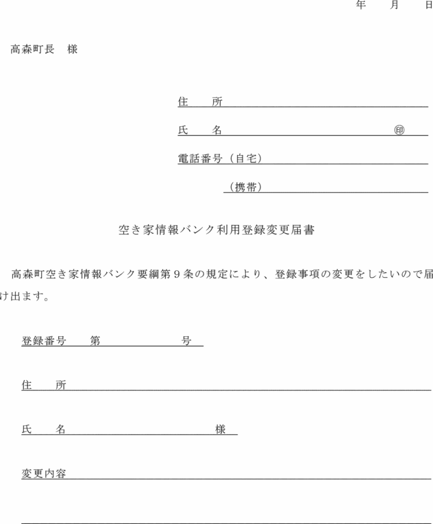 第9条 前条第3項の規定による通知を受けた空き家利用希望者(以下「利用登録者」という。)は、当該登録事項に変更があったときは、高森町空き家バンク利用登録変更届出書(